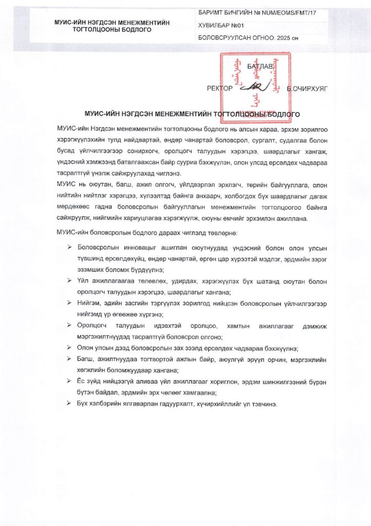 МУИС-ийн Нэгдсэн менежментийн тогтолцооны бодлого